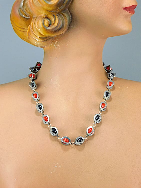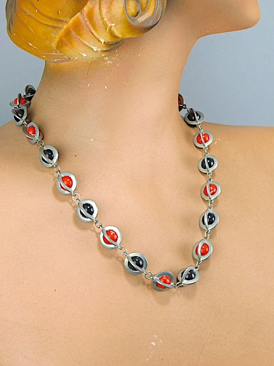Unusual Red and black galalith modernist American necklace. Metal cages with central balls.