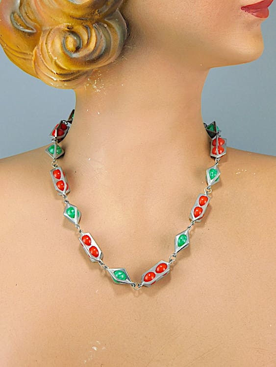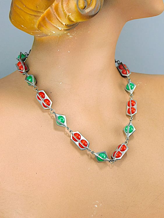 Unusual Red and green galalith modernist American necklace. Metal cages with central balls.