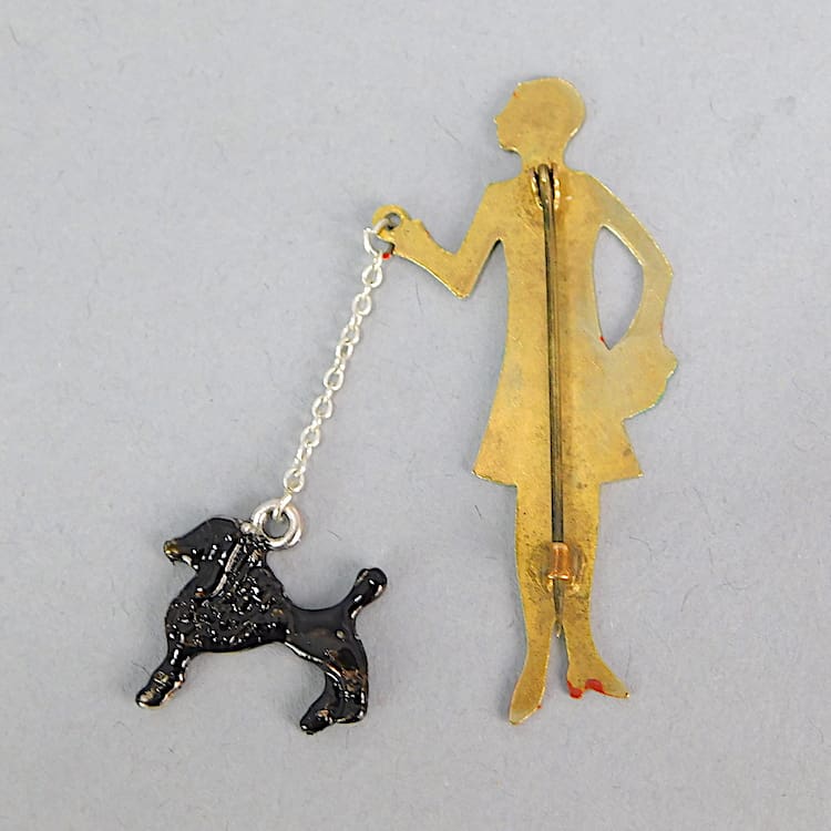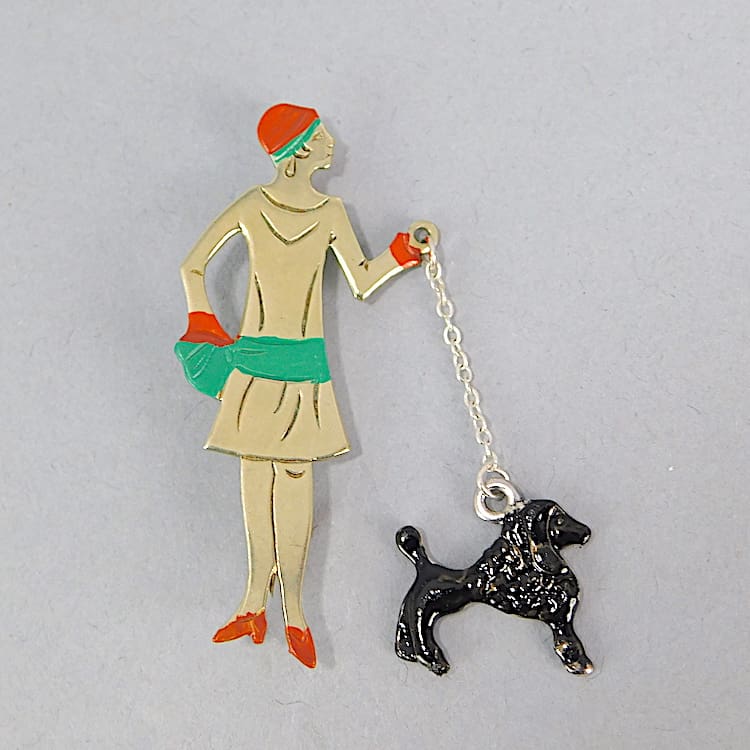 Flapper and dog brooch, given away with a years subscription to American vogue magazine. This one with an unusual black poodle.