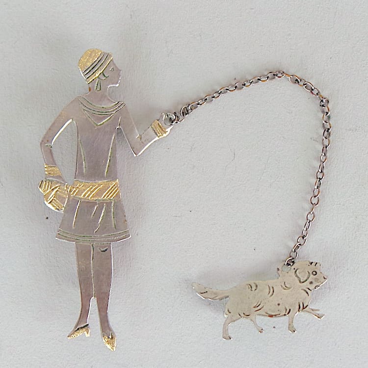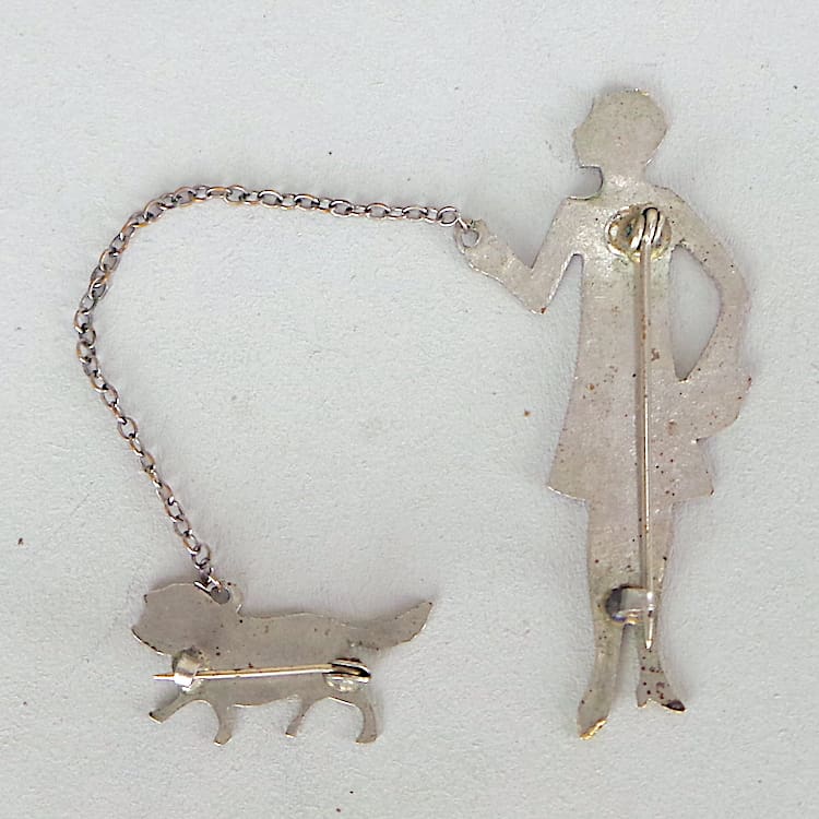 Depicts a lady walking her dog and the 2 pieces are held together by a chain (the dog lead).