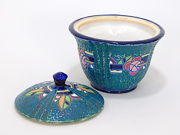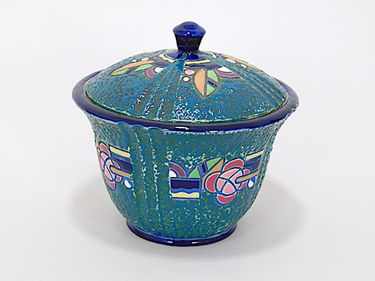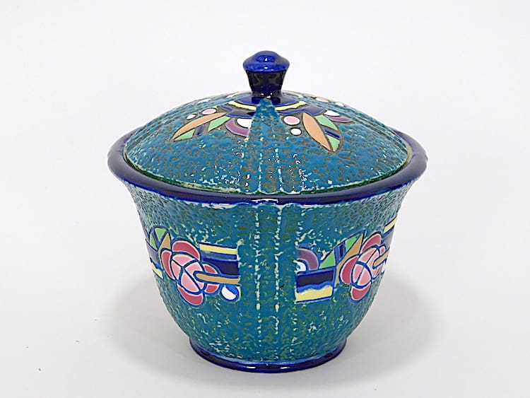 A Czech jar and lid with a light blue ground and multicoloured floral detail, marked with Amphora, Czech underneath.