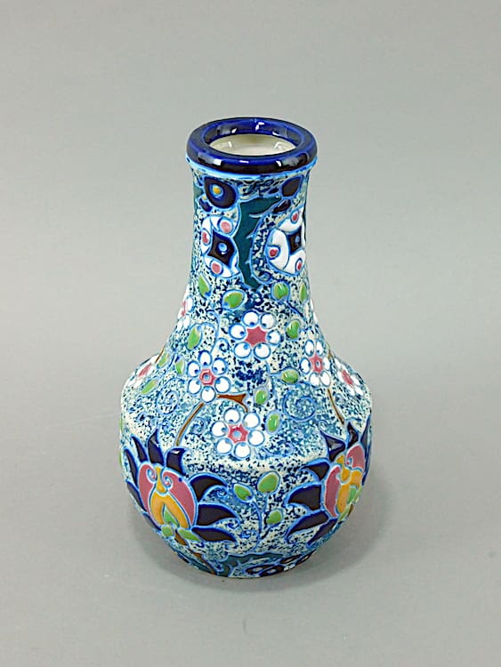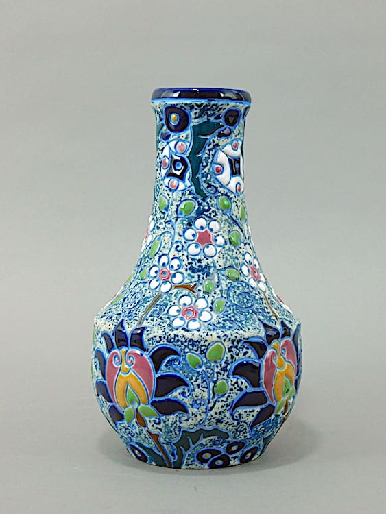 A pretty Czechoslovakian vase with high gloss enamel stylised floral detail in relief and sponged stone background. Marked Amphora to the base.