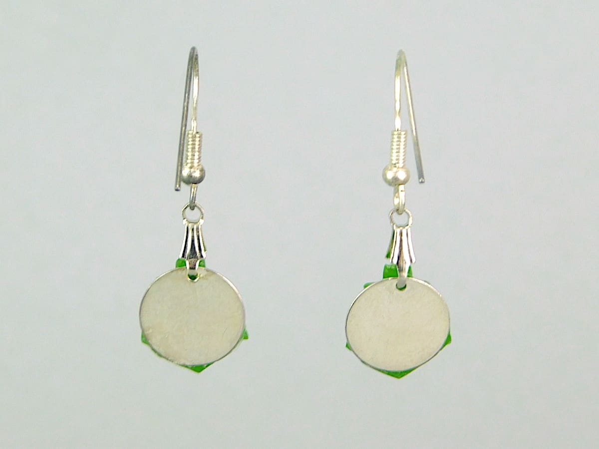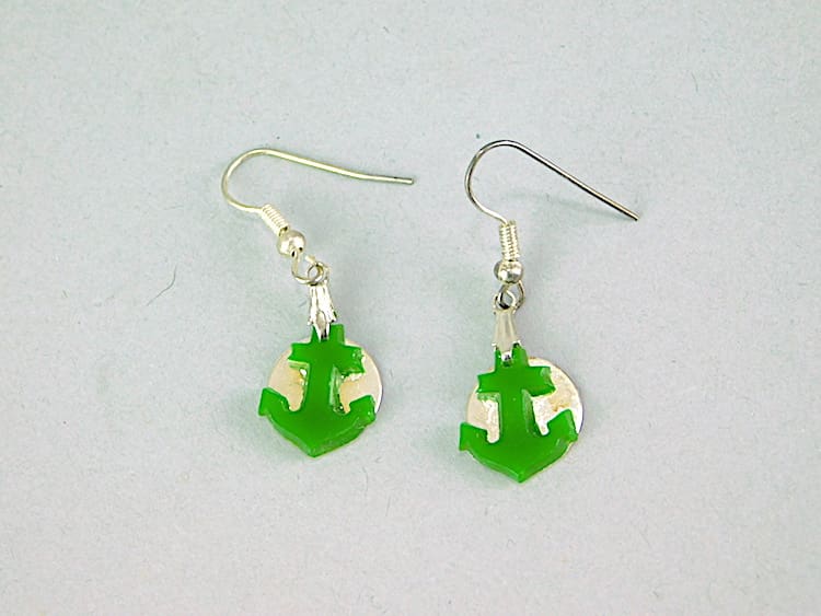 Green galalith anchors mounted on circular chrome backs. Made by Jacob Bengel for pierced ears.