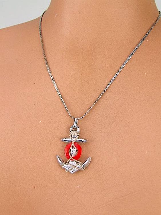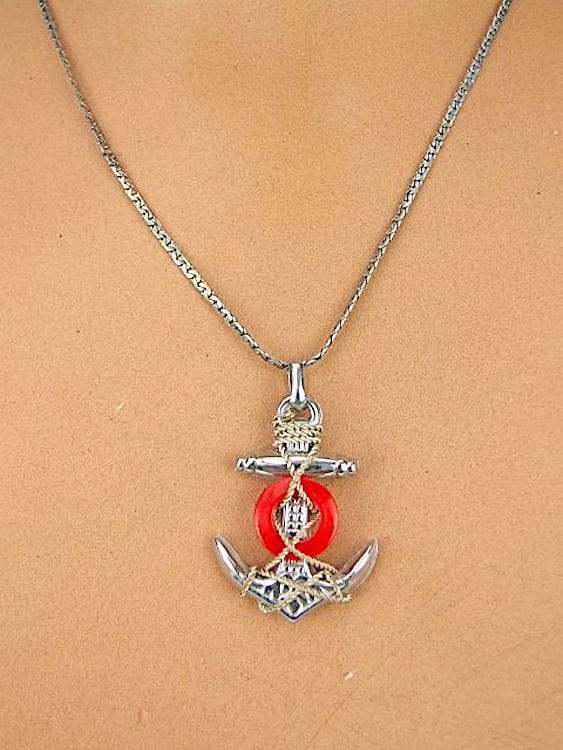 Red galalith and chrome delicate anchor necklace by Bengel.