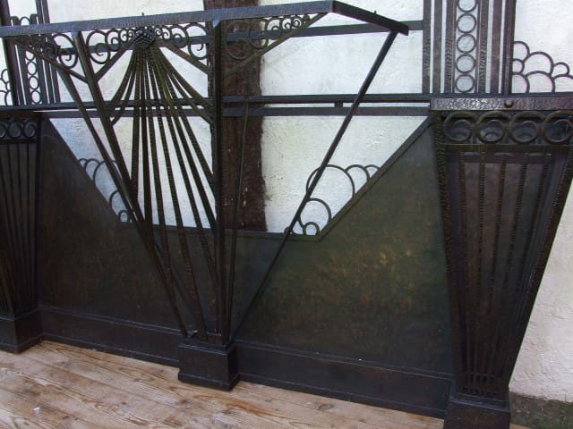 An art deco wrought iron hall stand by Andreoly Schreveck. An impressive French stand with provision for coats, hats, umbrellas and a pair of lights (we do not have the shades), a central mirror and marble top. Three different types of decoration to the tapped metal plus lots of impressive, typically French art deco scroll work. An exceptional piece and signed to the base Andreoly Schreveck.