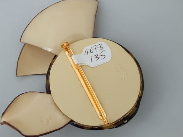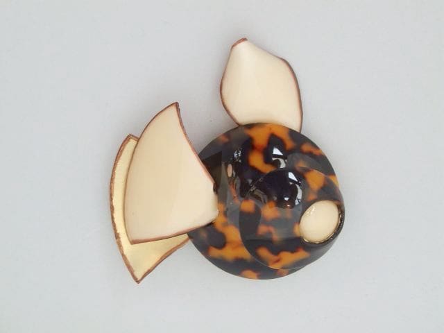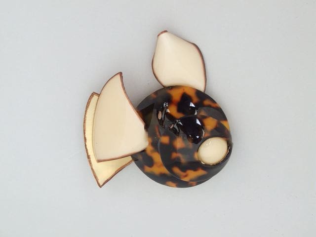 French angel fish in cream and tortoise shell phenolic material. It is signed Celia, Paris to the back and fitted with a roll safety claps.