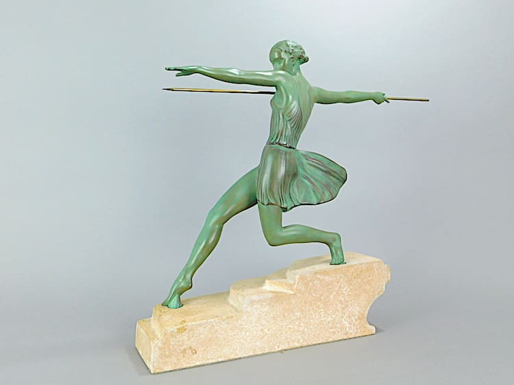 A green patinated spelter figure on a stepped stone base. She has a brass spear and this one is unsigned but definitely by Fayral.