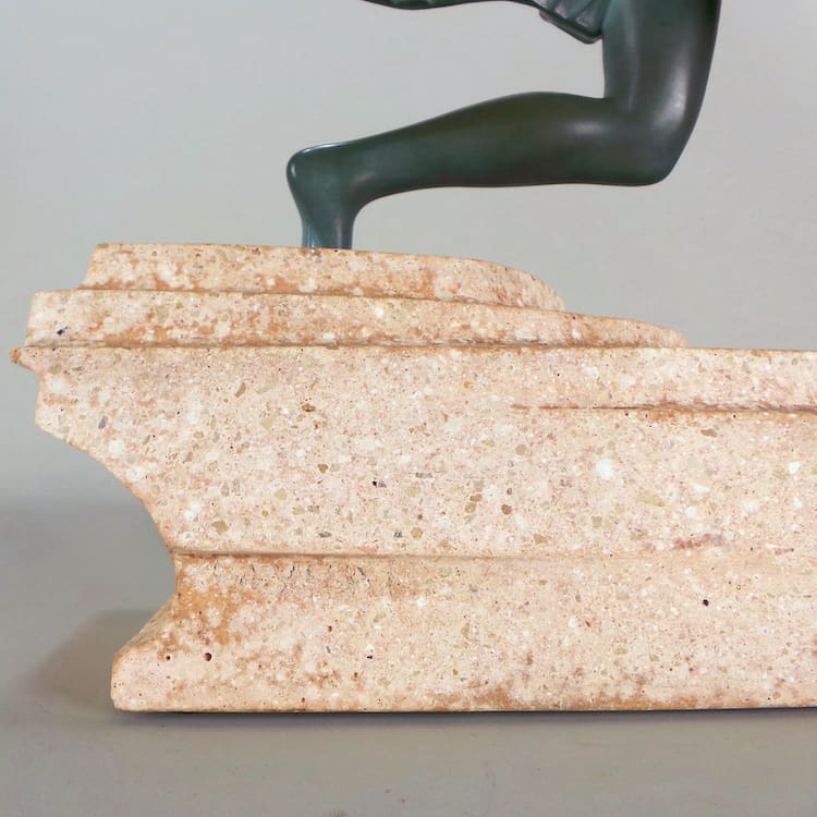 A vintage green patinated art deco art metal figure on a stepped stone base.