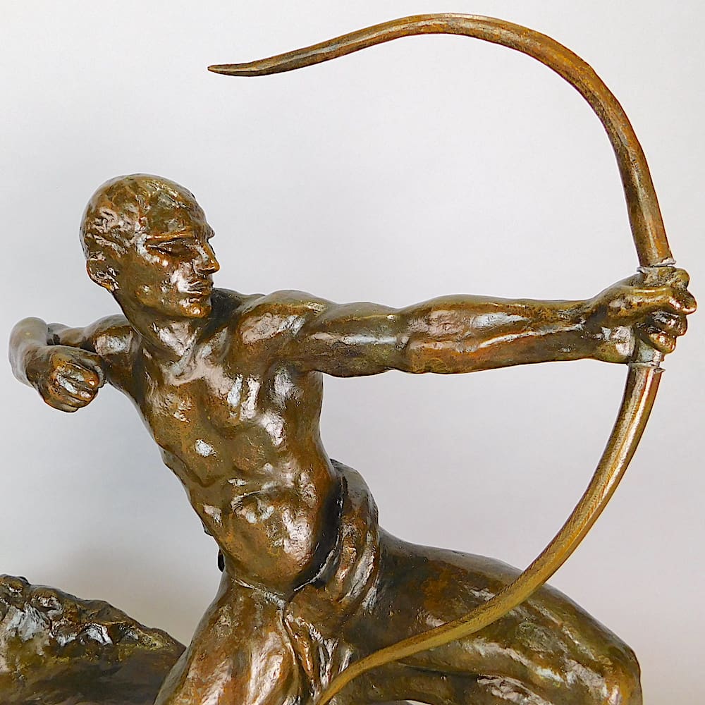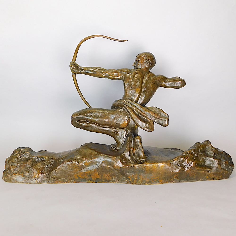 Large bronze male archer by Amadeo Gennarelli with an unusual long rock base.