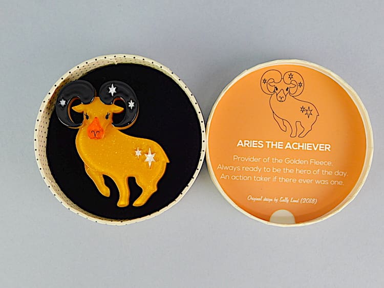 Aries the achiever brooch by Erstwilder. Fitted with a roll safety clasp. Comes in its original box with teapot tag and stamped with the Erstwilder bluebird to the reverse.