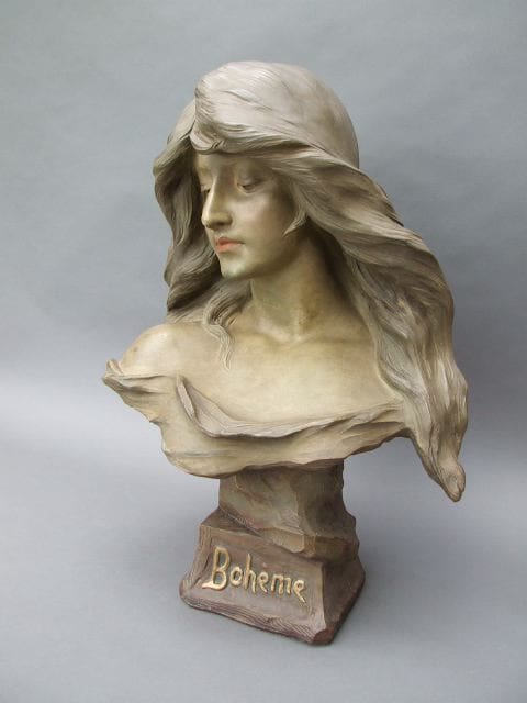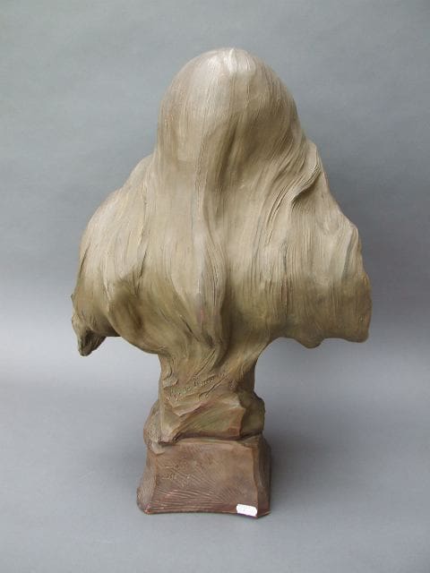 A large terracotta art nouveau bust by the Italian sculptorĀ Aristide de Ranieri. Titled Boheme and signed to the back by the artist A. De Ranieri and stamped with various numbers. Aristide Ranieri, 1880 – 1914, was born in Italy but worked in Paris.