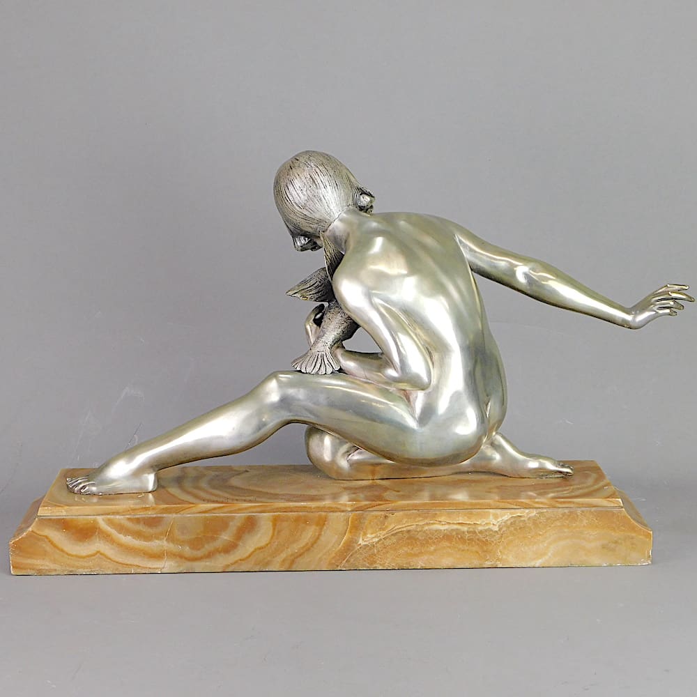 French art deco silvered bronze girl holding a bird by Armand Godard.