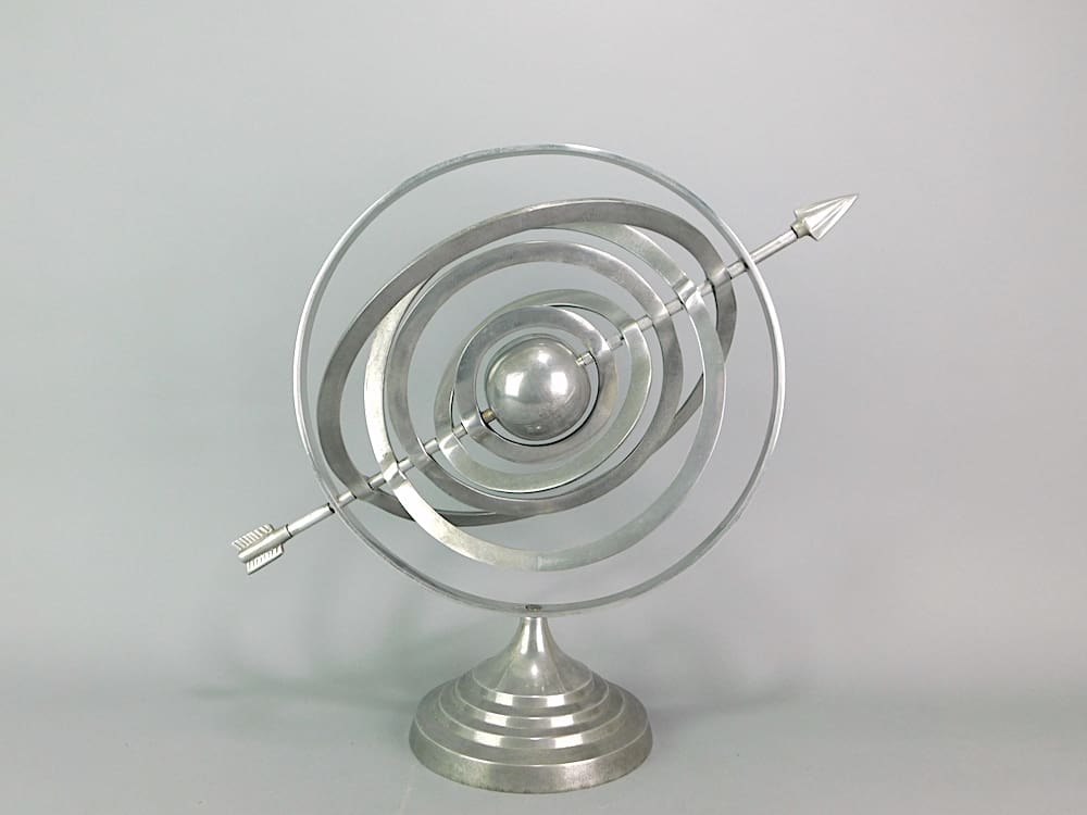 Polished aluminium armillary sphere mounted on a circular base.