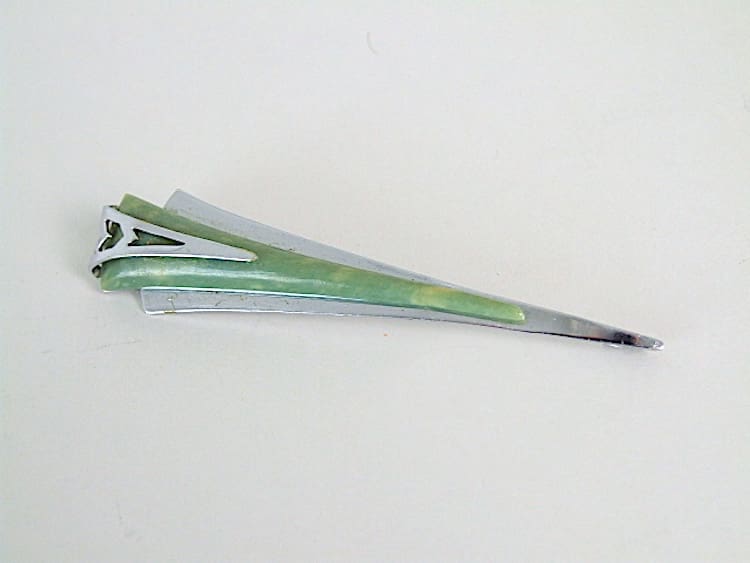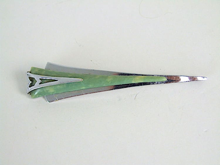 Art deco chromed metal and green marbled modernist galalith arrow shaped brooch. Made by Bengel in the early 1930s.