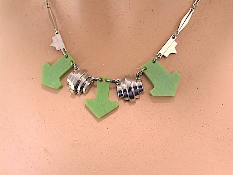 Green galalith and chrome odillon panel necklace. A more delicate Bengel. Made in the late 1920s – early 1930s by the Jakob Bengel company in Idar Oberstein Germany.