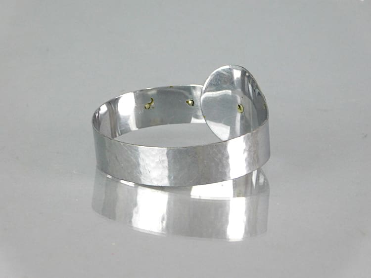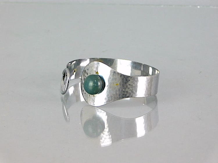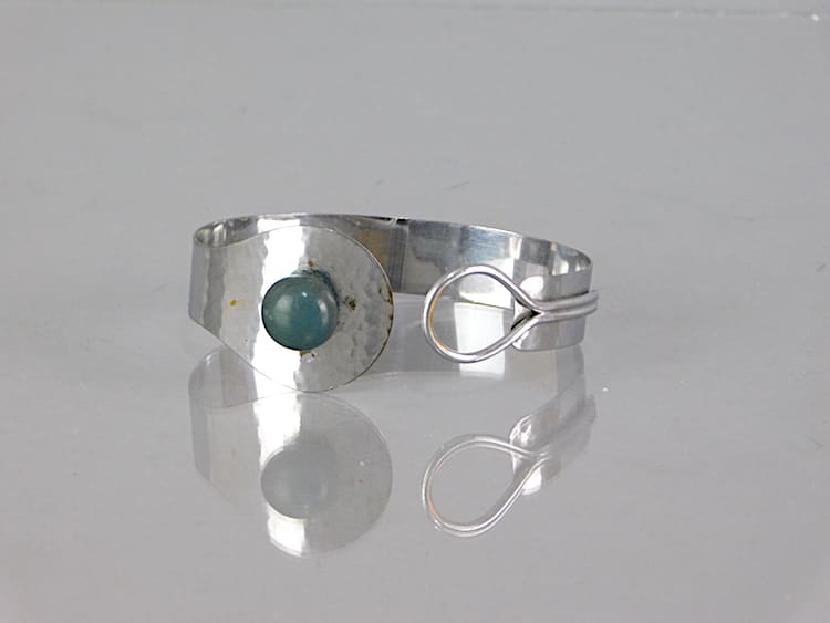 Art deco metal bangle with green stone detailing.