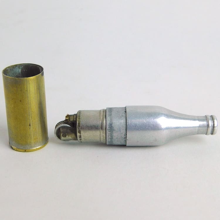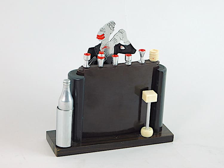 French art deco hand painted bakelite bar tender cigarette box. This is a rare one as the bakelite cigarette holder section of the bar lifts out and it has its original bottle lighter to one side of the bar. Signed Sudre to the back of his trouser leg. The Base is made of macassar wood.