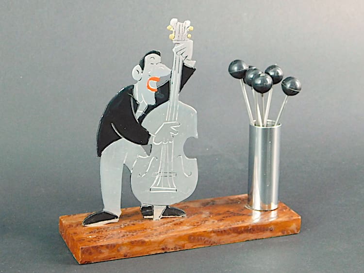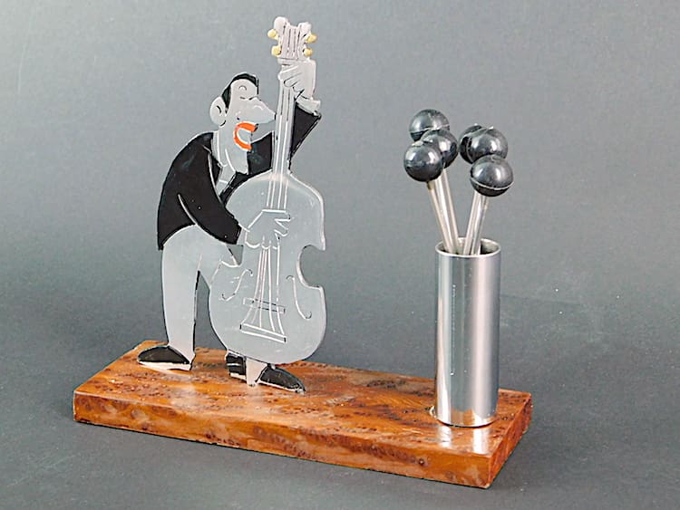 French hand painted art deco bass player cocktail sticks set, an unsigned Sudre.