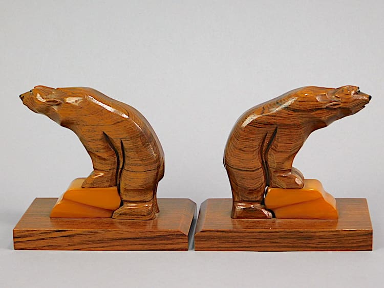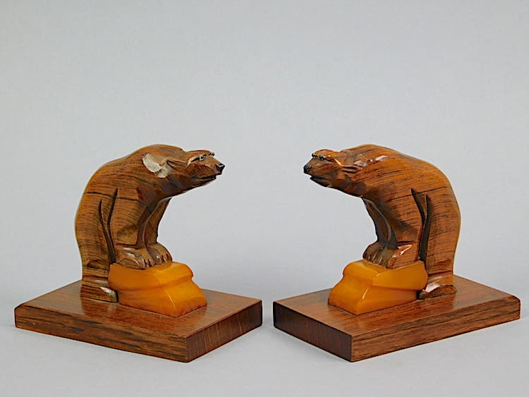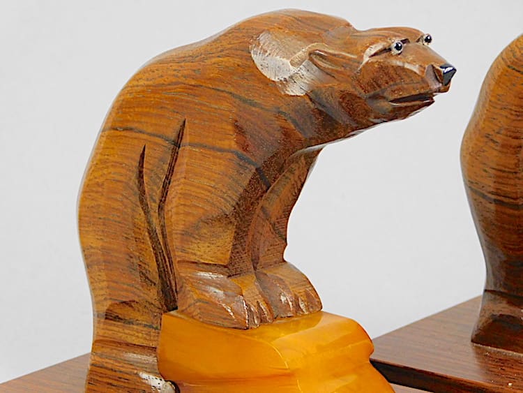 French art deco phenolic and hand carved walnut stylised bear bookends, mounted on rosewood bases.