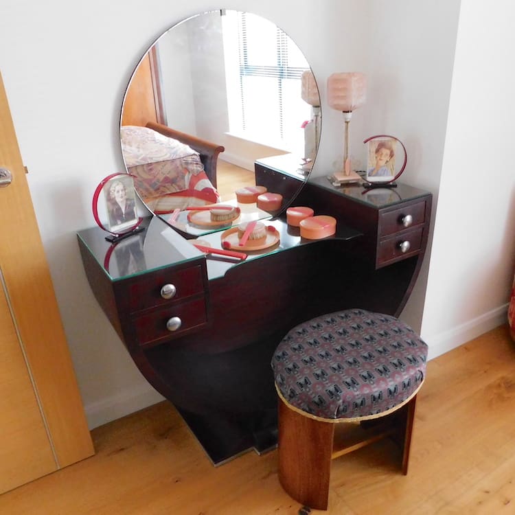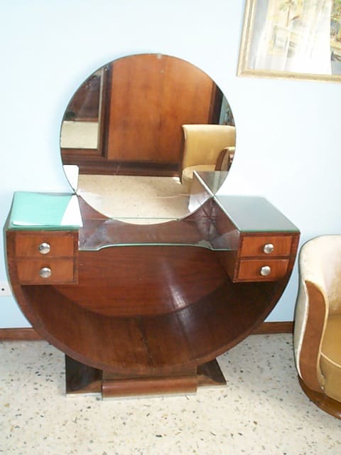 The matching rosewood dressing table with 4 drawers, glass shelf and circular mirror. It measures 43.5 inches (110cm) wide, 16.5 inches (42cm) deep and a total height of 53.5 inches (136cm) and to the top of the flat surfaces 29.5 inches (75cm).