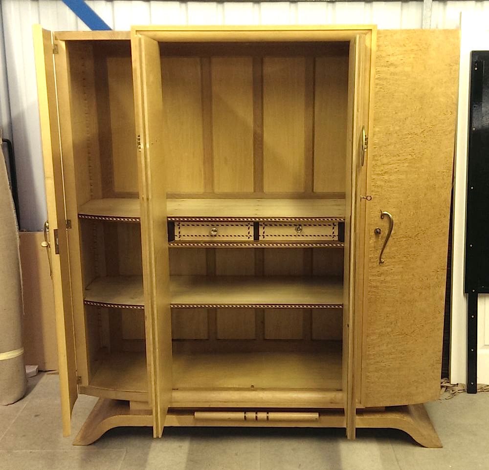 The inside of the wardrobe is fitted with shelves and 2 central drawers (one locking) – all with marquetry inlay to the front edges. It could easily be converted to a hanging wardrobe as shelves are moveable. It measures 68 inches (173cm) wide, 72 inches (183cm) high and 20 inches (51cm) deep. The bronze Leda and the Swan plaque to the front of the wardrobe forms part of the handle of the 2 central doors of the wardrobe.