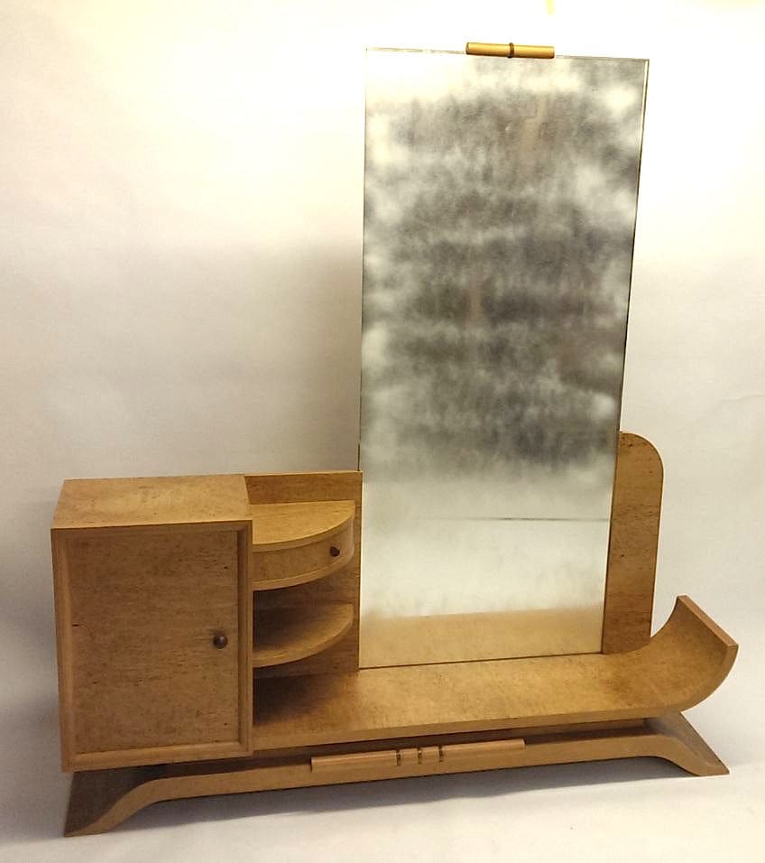The very stylish dressing table. With a single cupboard flanked by a pair of curved shelves with curved drawer, mounted on a sledge base with matching sabot detail and large cheval mirror. It measures 60 inches (152cm) wide, 13 inches (33cm) deep and total height including mirror is 67 inches (170cm). The picture shows the glass diffused to reduce photographic reflection but the mirror is in good condition.