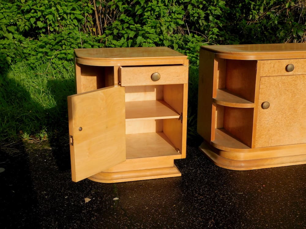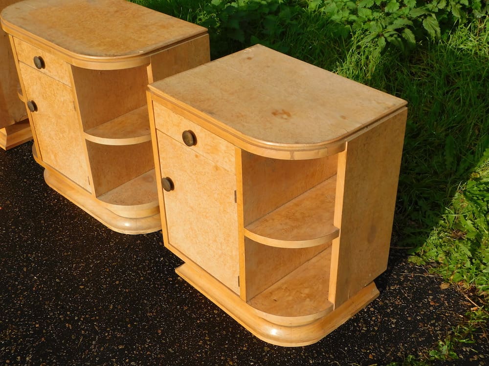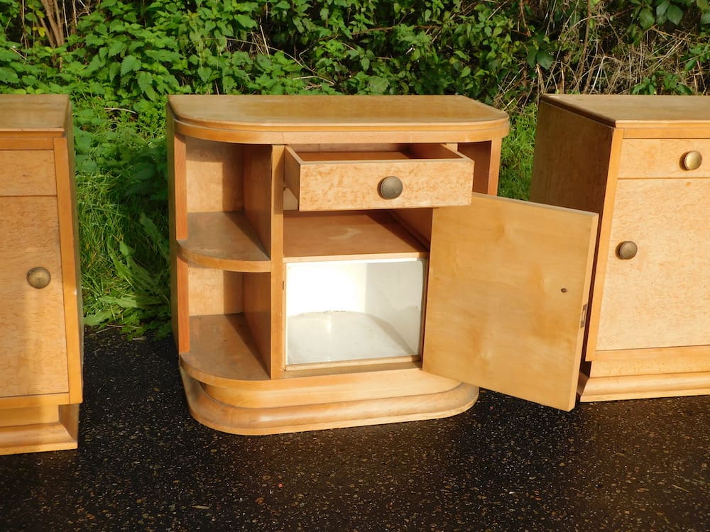 A pair of art deco bedside cabinets (middle cabinet now sold). Made of blonde maple and with a single drawer over a cupboard section with shelves and end shelf section.