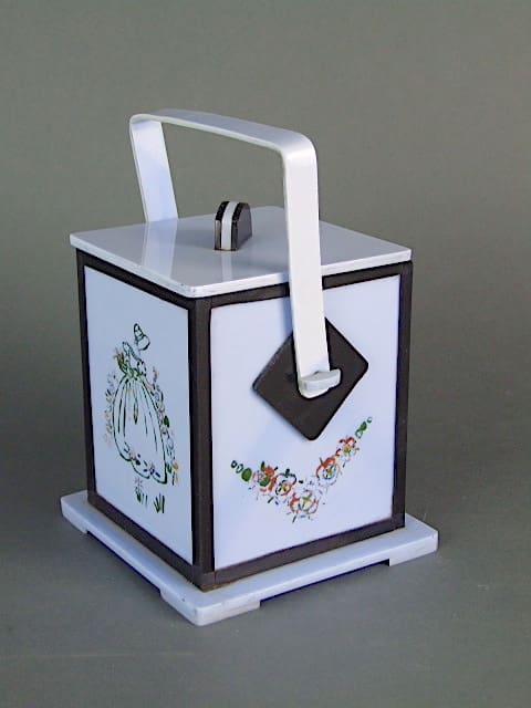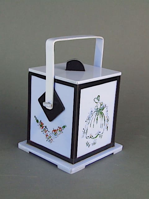 Large blue and black phenolic modernist lidded box. Typical English when they thought it was OK to do a fabulous art deco modernist box and then add a crinoline and flowers detail.