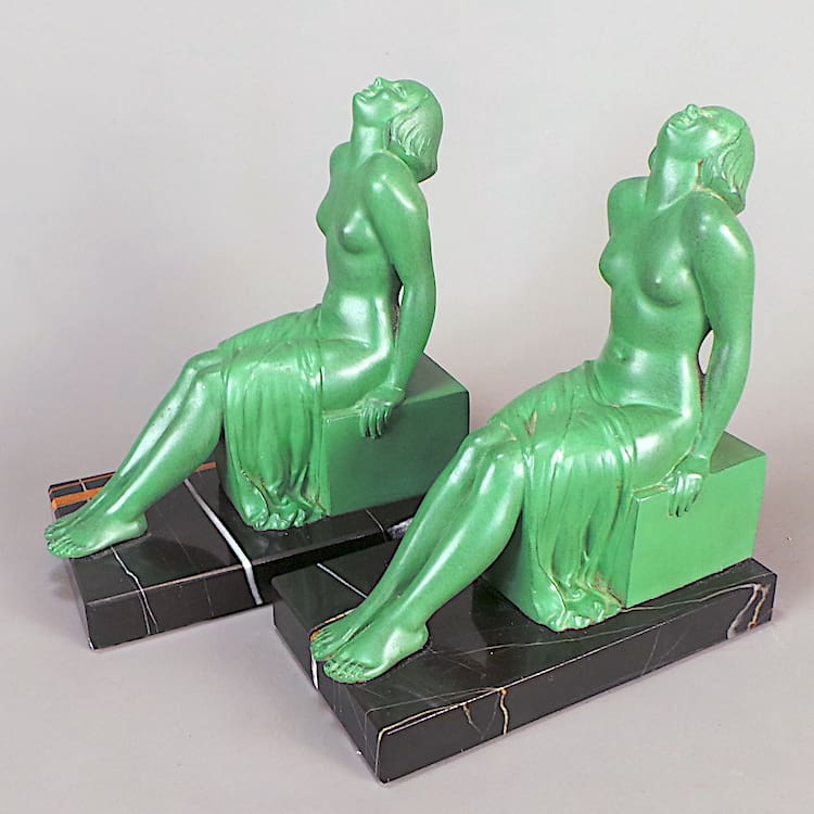 Vintage French art metal art deco nude lady bookends. Their title is – Insouciance