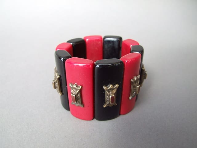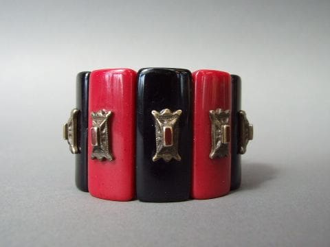 Red and black galalith elasticated bracelet with central filigree panels with red centres.