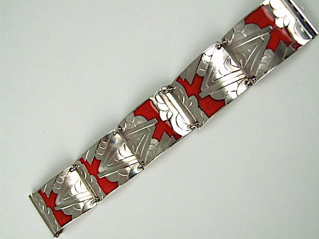 French silvered metal and red enamel bracelet with art deco motif to the metal band.