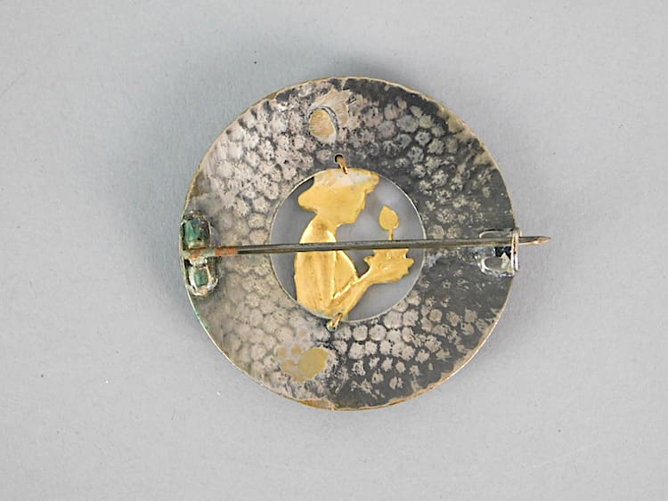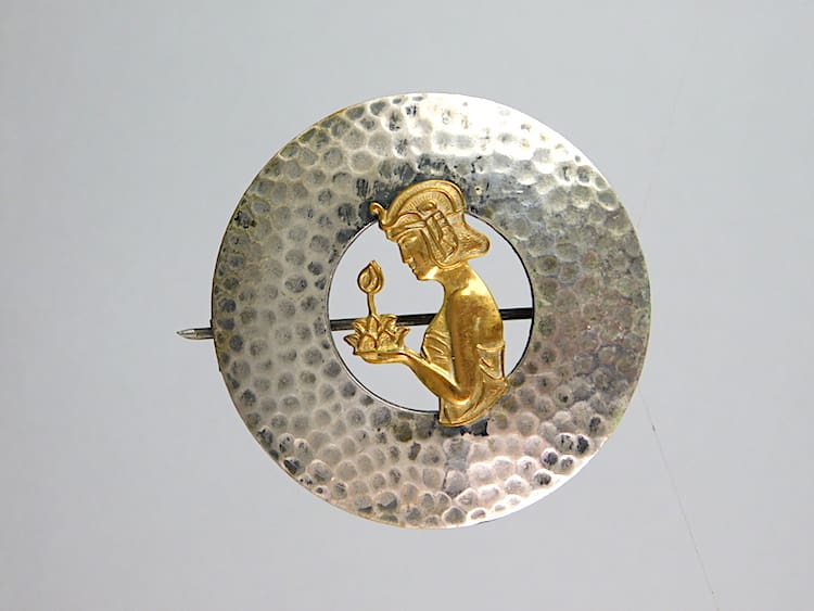 Large pewter and metal brooch with hammered surround and the image of an egyptian female.