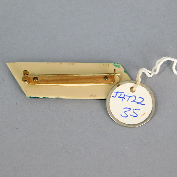 A vintage phenolic brooch, originally possibly green and cream.