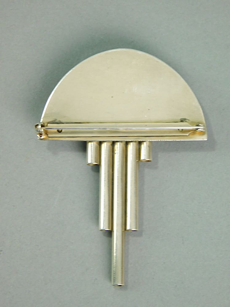 French art deco modernist silvered metal brooch with original 1930s findings in black onyx and green galalith.