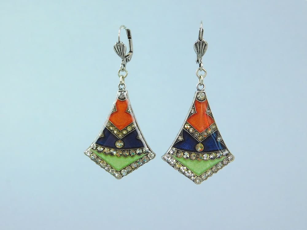 A brooch and earrings set by Pierre Bex of Paris. Enamel earrings for pierced ears measuring 2.25 inch drop (5.5cm). In good vintage condition as new/old stock item.