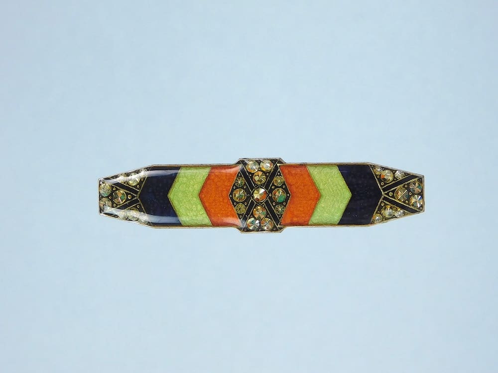 French enamel brooch by Pierre Bex – Paris, fitted with a slide safety clasp that is signed P Bex. It measures 2.5 inches wide (6.5cm). In good vintage condition as new/old stock item.