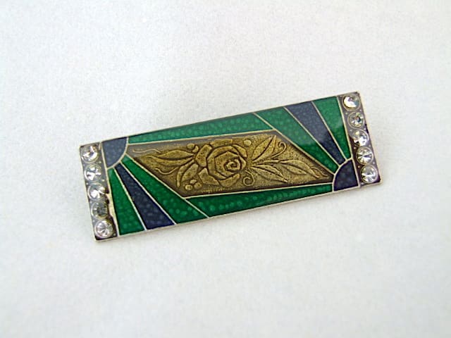 French art deco enamel brooch with sun ray detail and central stylised flower.