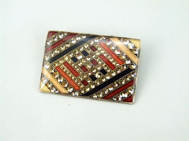 French enamel and diamonte art deco brooch in red, orange, black and coral. Made by Pierre Bex.