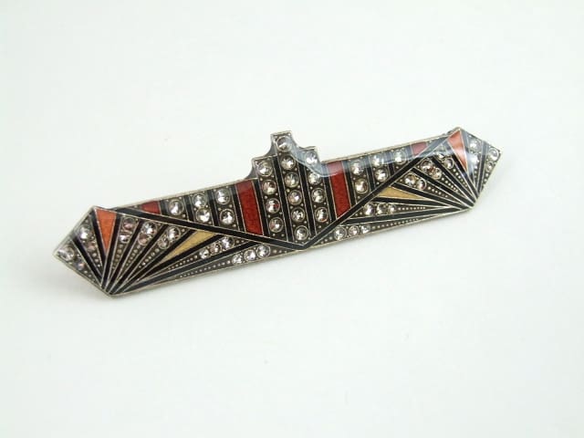 Large French art deco brooch with enamel and diamonte patterning.