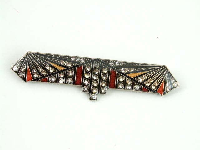 Large French art deco brooch with enamel and diamonte patterning.
