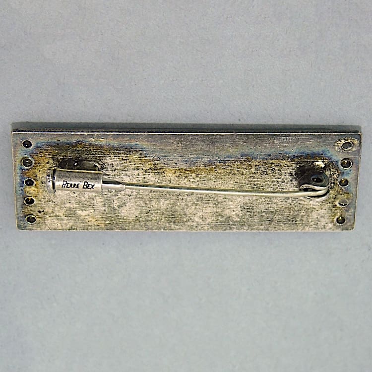 French art deco brooch in cream and blue enamel with sun ray detail and central stylised flowers.