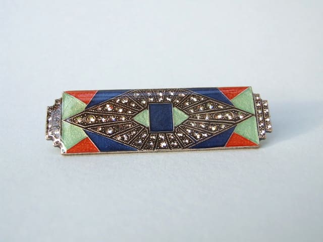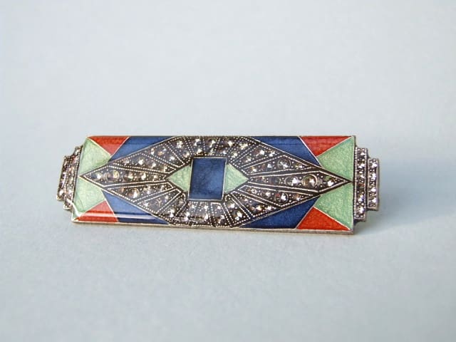 Large art deco brooch with enamel and diamonte patterning. Fitted with a French slide safety clasp.