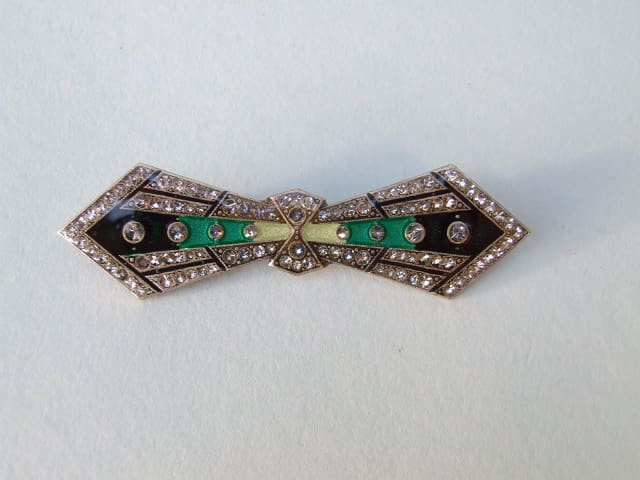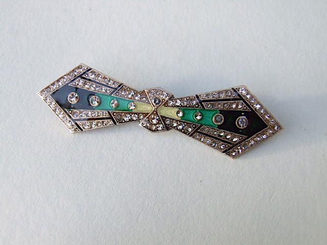 Large art deco bow brooch with enamel and diamonte patterning. Fitted with a French slide safety clasp.