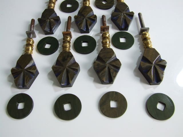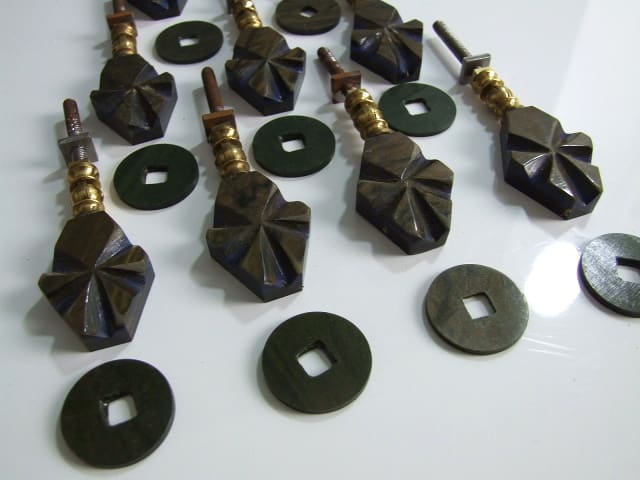 Set of 10 carved phenolic cabinet handles. In green and blue phenolic material with brass finials. Possibly bakelite?