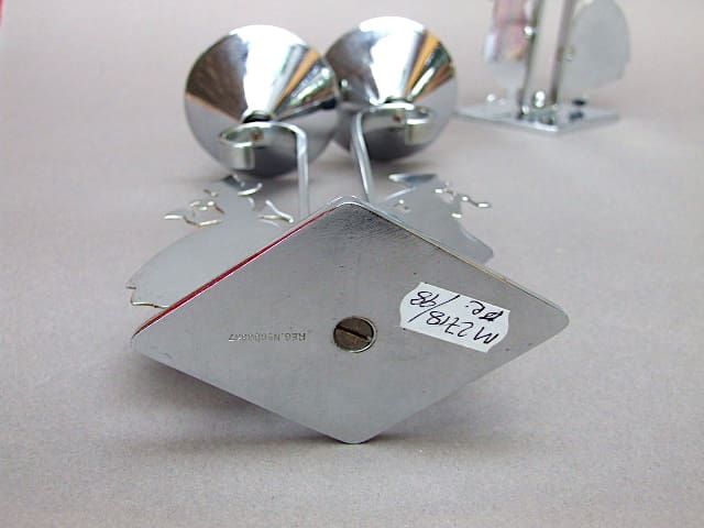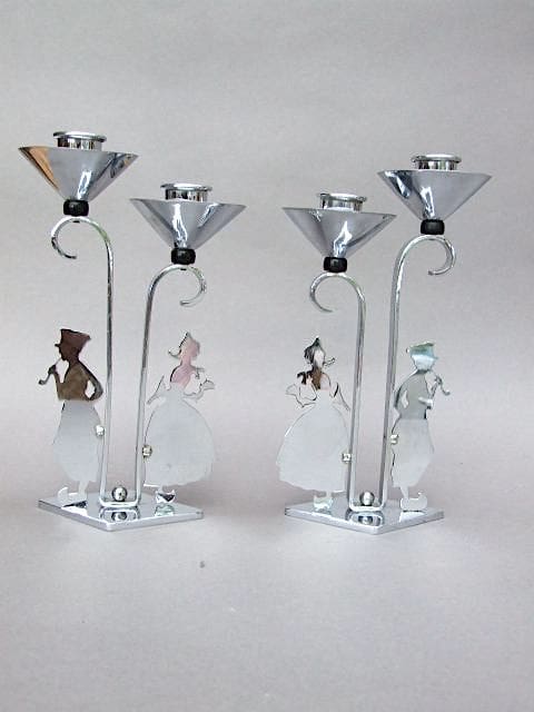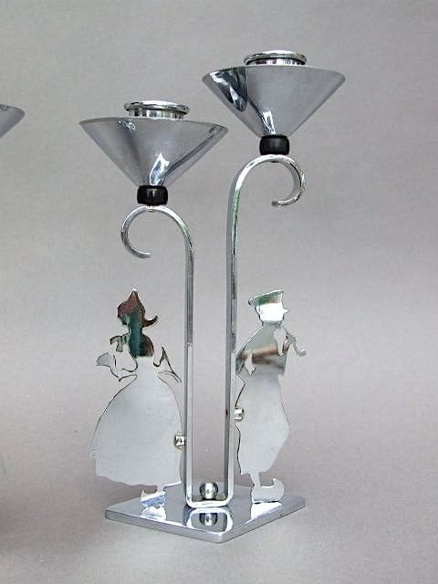 Pair of English chrome and phenolic candle sticks with silhouettes of Dutch children.