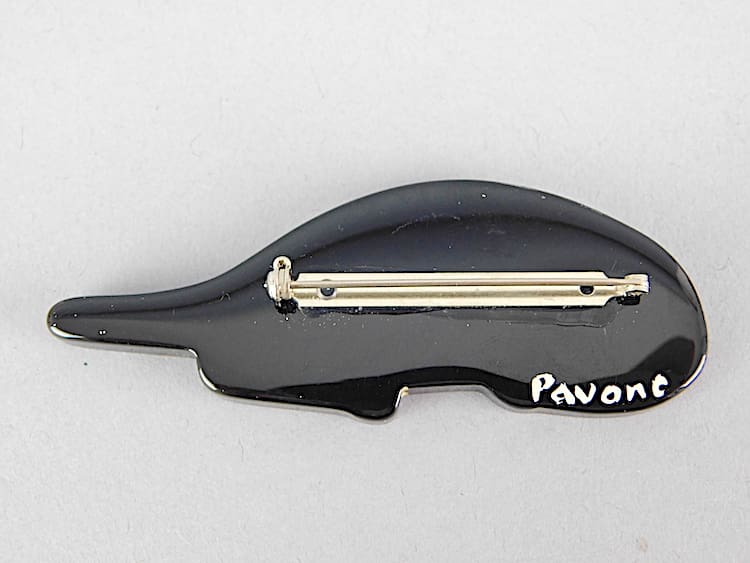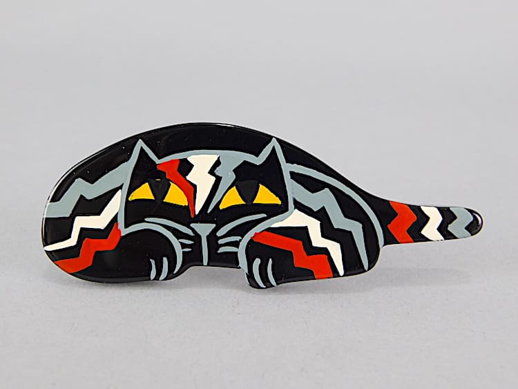 French art deco galalith hand painted brooch by Marie-Christine Pavone known as Chat Riton. No longer in production and signed to the back and is fitted with a roll safety clasp.