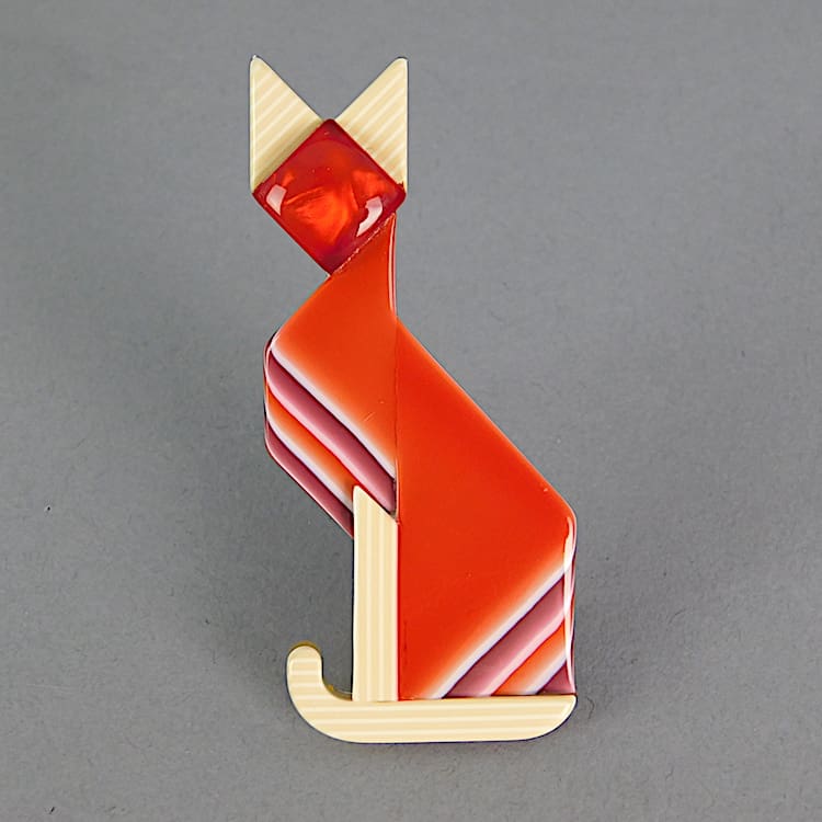 Vintage red art deco cat brooch. It measures 3 inches high (7.5cm) and is signed on the safety V clasp. Similar ones can be viewed in the Lea Stein Book p51. In as-new condition.