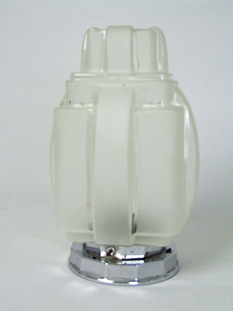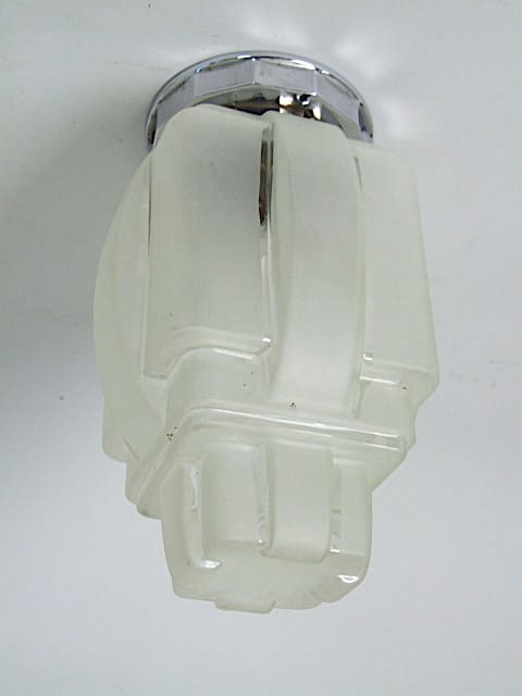 French art deco frosted glass blancmange shaped ceiling lamp. It has a chrome gallery holder.
