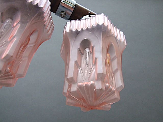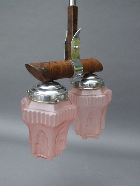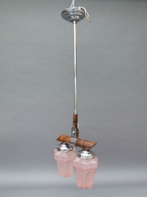 This twin lamped ceiling light still has its original long chrome stem and ceiling rose. The two peach moulded glass shades hang from a macassar wood bar. The stem can be shortened to suit your particular needs.