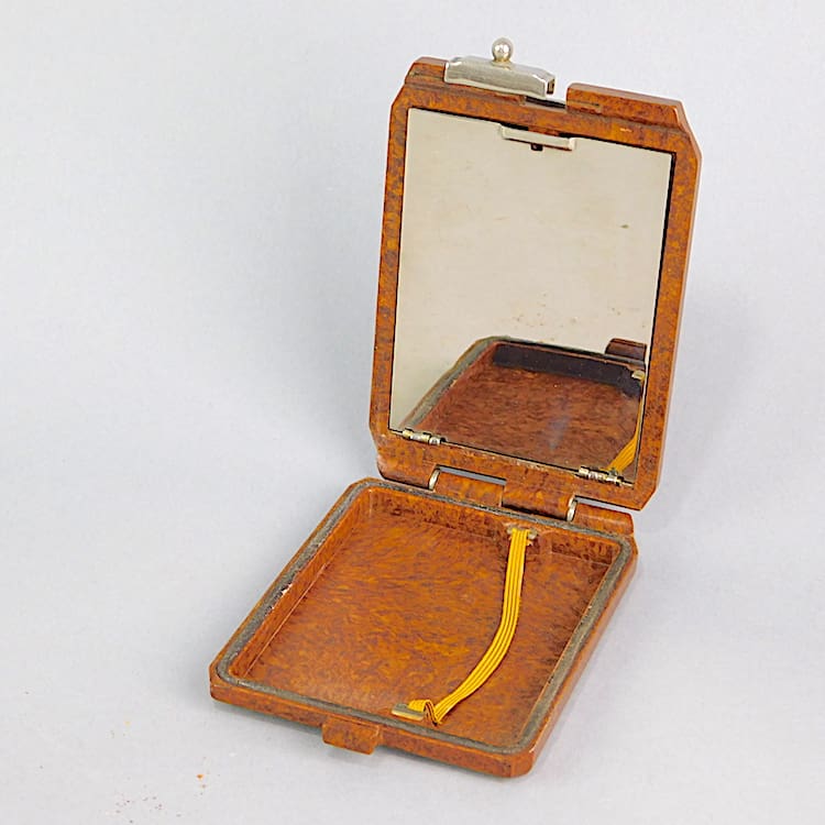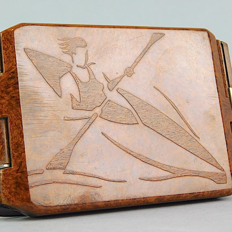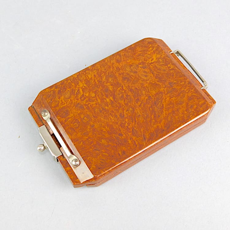 Brown bakelite cigarette case with a stylised lady to the cover. Inside are 2 separate sections with a chromed metal panel separating them.